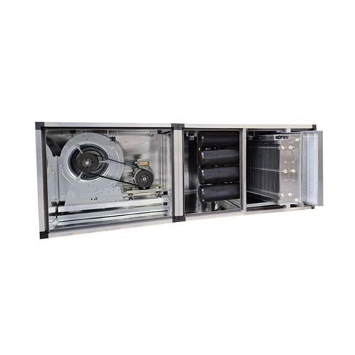 Il ventilatore centrifugo a doppia aspirazione è costruito con robuste lamiere zincate a caldo. La ventola del tipo a pale rivolte in avanti, è bilanciata staticamente e dinamicamente